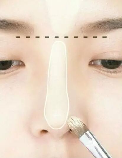 从眉头中心往下延伸到鼻头部刷上亮色修容。刷上时要依照自己鼻梁的宽度来调整,鼻梁窄的人画细一点,鼻粱宽的人画粗一点。
