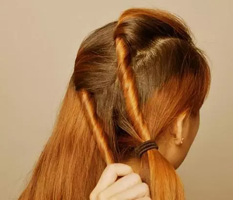 步骤四:最下面的一层也是扭转后放在右边和之前的两束马尾扎在一起。