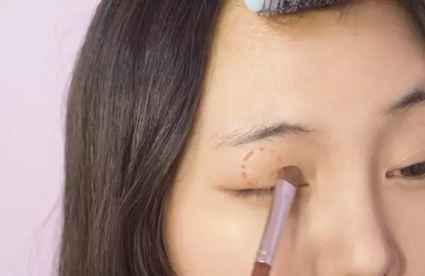 在上眼妆之前,先用杏色眼影刷在卧蚕位置,起到放大眼睛的效果。
