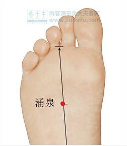 涌泉穴位于足底前部凹陷处,第2、3趾趾缝纹前端与足跟连线的前处,左右脚各有一穴。