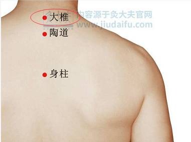 取穴时,将领部稍微向前倾,往项部与背部交界附近找寻,可以触摸有一凸出的最高点是第7颈椎,其下方的凹陷处就是大椎穴。