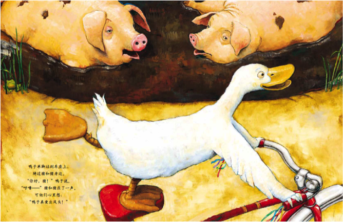 http://pic.davdian.com/uedit_upload/2017/03/31/668_434_2596924d4ca47ae28d04d9f6d3145713.png绘本中,作者尽情地展现出了鸭子骑车的快乐,他在自行车上做出各种动作,蹬车、挥手、脱把,甚至还能站到车座上。他与一路上遇到的每一个农场朋友打招呼,尽管他们有的嘲笑、有的嫉妒、有的羡慕……