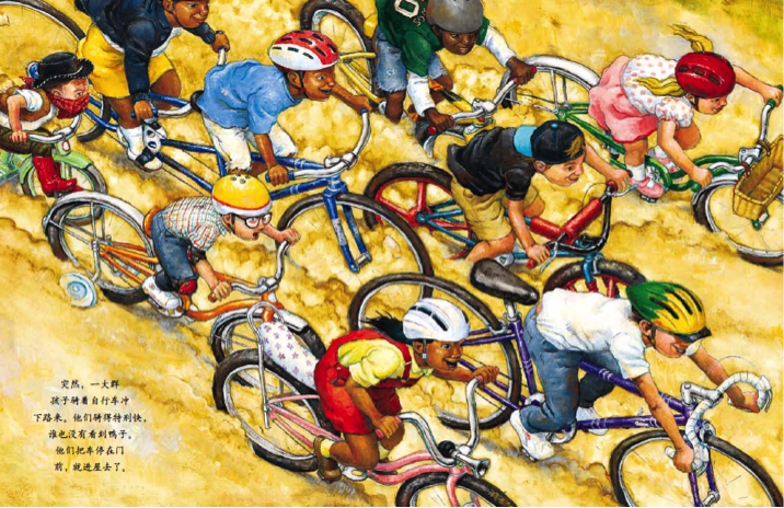突然,一大群孩子骑着自行车冲下路来。他们骑得特别快,