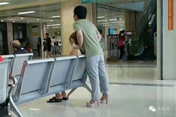 这个照片是在重庆一家医院里拍到的,女朋友在等着看医生,穿高跟鞋脚太累了,就换上男友的平底凉鞋,而男友,则穿着女友的粉色高跟,还不忘给女友来一个肩部“马杀鸡”。