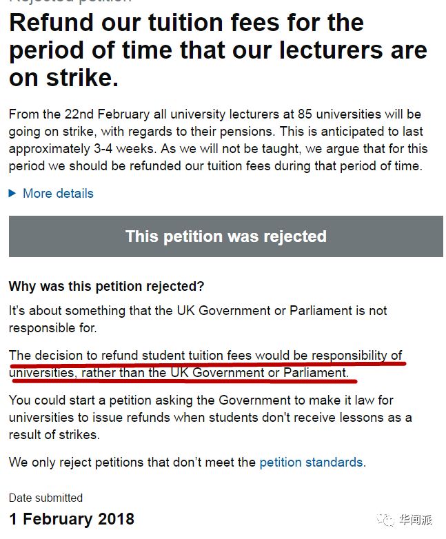 由于老师罢工,不少学校的学生向各自的学校发起请愿,要求退回罢工期间所交的学费,甚至在英国政府和议会的官网发起请愿。但是这一请愿被英国政府和议会驳回了,理由是“退回学费更多的是学校的职责,而不是政府和议会。”