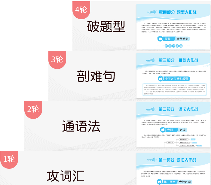 其他书都是三轮复习,而这本书分了四轮来复习,依次是:一轮复习—词汇;二轮复习—语法;三轮复习—难句;四轮复习—题型。每一个考点讲得都非常详细,非常透彻。