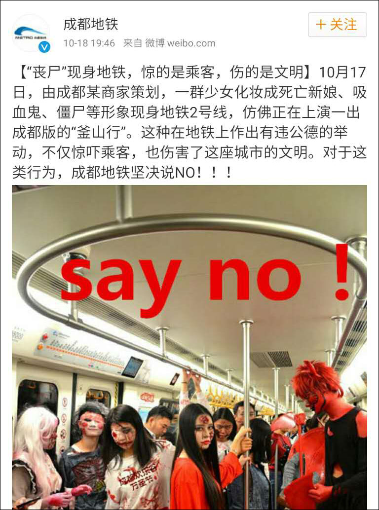 也有一些网友不认为打扮成鬼怪会“惊吓乘客”。成都地铁微博原文里提到的丧尸片《釜山行》在中国就风靡一时。
