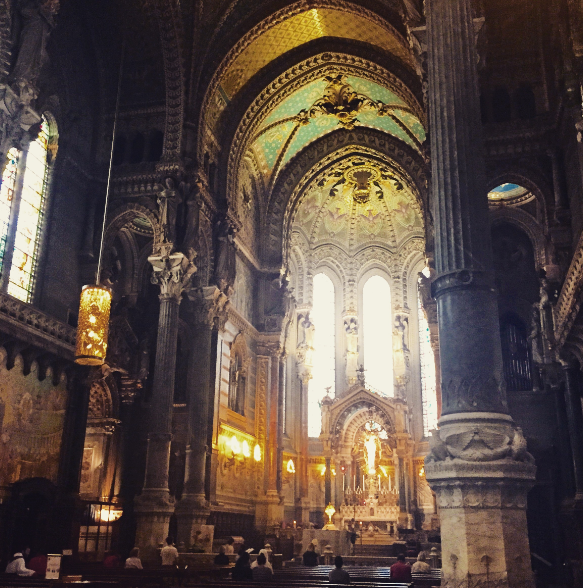 需是沿着很陡的坡道爬到山顶的(如果想轻松一些可以搭乘地铁+小缆车电车直达教堂正门,但这样就是去了沿着抵抗地心引力爬坡顺带看着风景渐渐开阔的乐趣了哦,所以建议下山选择轻松路线),这一路的疲劳在看到开阔的里昂全景时就给治愈了。没有高楼而忠于规划的城市如此赏心悦目,双河静静流淌。背后的圣母教堂外墙朴素庄严,四个塔楼以典型的罗马式加拜占庭式罗列,终于不再是欧洲嗜好的哥特式风格,然而真正的惊喜在于教堂内。不曾想内里是如此奢华,有拜占庭式马赛克镶嵌画与壁画,有19世纪末流行的新艺术运动装饰风(运用在玫瑰花窗中),有拉斐尔前派绘画中的各种流畅曲线(运用在雕刻和柱子中),地砖也是极好看的。