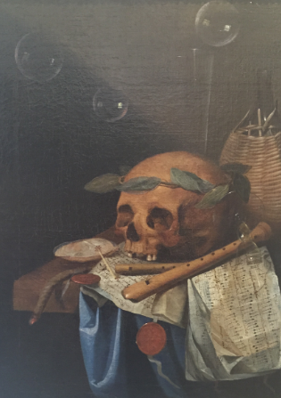 “虚无,虚无,万事皆空”——这是17世纪尼德兰画派盛行的“虚空派”,在物质过剩的新兴荷兰共和国,在彼时艺术界奉行巴洛克审美风潮之时,出现这一画派反思着人生浮华享乐不过是掠影,唯有死亡是永恒。因而,该画派的画面中总是出现阴暗的视角,常见骷髅头盖骨,枯萎的花朵,沙漏,钟表,科学仪器,书本,以及象征“生命易逝、繁华不过泡影”的气泡。就像这幅画所表现的内容