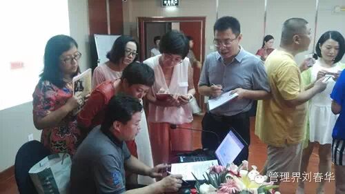 中间休息的15分钟是刘老师最“尴尬”而又“温馨”时间:刘老师遭到了现场学员的“围住堵截”,因为现场学员中有一部分经常关注天津卫视《非你莫属》栏目,还有一部分本身就是企业的高管,听过刘老师的课;还有的学员是原来刘老师的同事。今天,他们都成为了老师的粉丝。索要签名者把笔记本齐刷刷的递过来,刘老师淹没在一片人海里。组织方不得不解围,但是没有效果,刘老师只好幽默地说:去厕所总得让去吧,大家哈哈而笑,瞬间让开了一条小道。