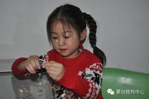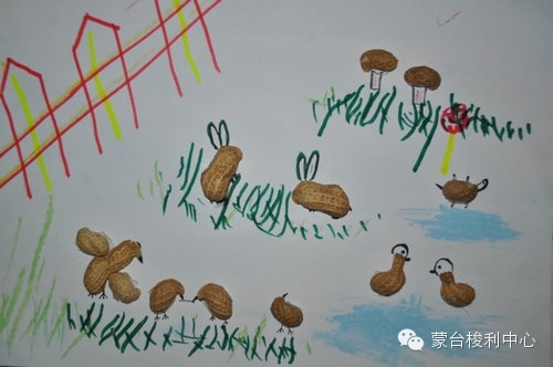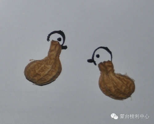 平时,没有心思。现在一琢磨,不同形状、不同大小的花生壳还真能有大作用。红豆喜欢小动物,我就用花生壳创作一组小动物形象吧。花生壳的粘贴面很小,粘贴花生壳的工作只有由妈妈完成了。