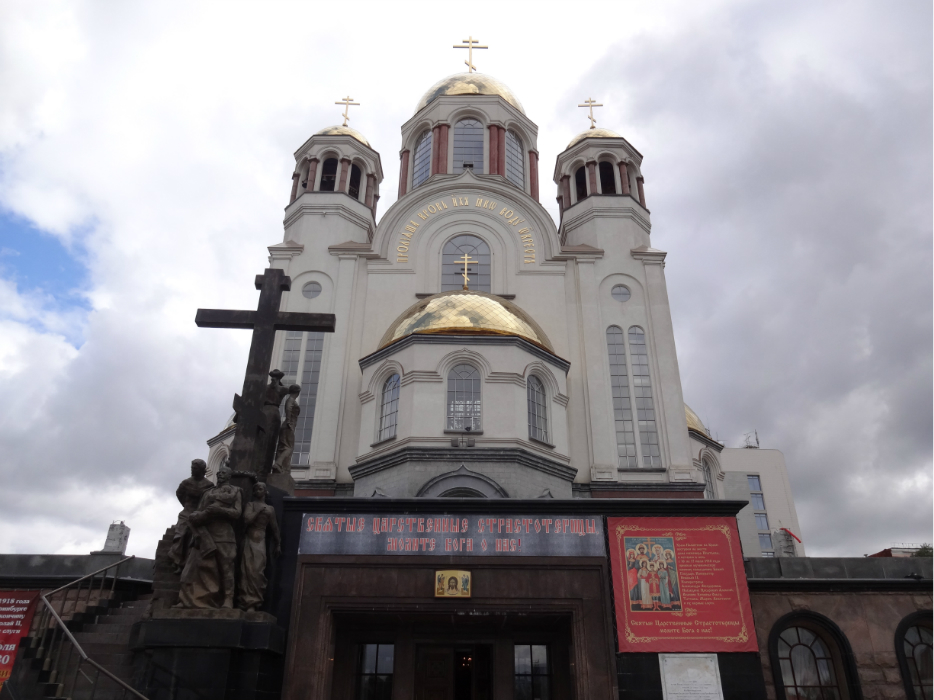 门口是罗曼诺夫纪念碑,这是一组青铜群像,在巨大的十字架下,尼古拉二世抱着14岁的王子亚列克塞走在最前面,皇后与公主们紧随其后,一家沿着螺旋楼梯步入地下室去迎接自己的死亡。1918年7月6日晚上,沙皇尼古拉二世和他的妻子,还有四个女儿和一个儿子,在一个工程师住宅的地下室被处决了。