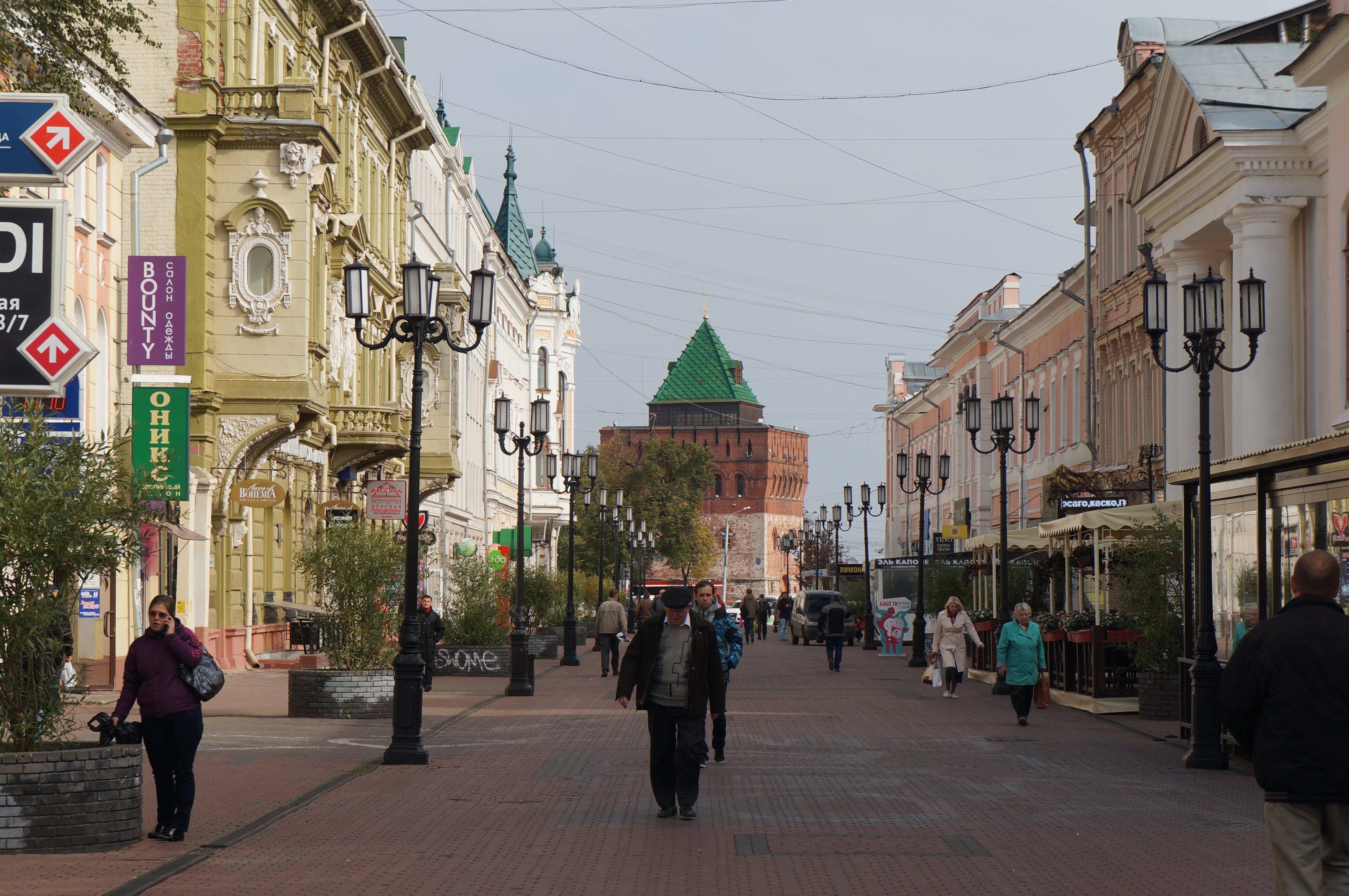 这座位于伏尔加河下游的城市极具悠闲的氛围。克里姆林宫南墙外广场,是这个城市的主要街道,成放射状通向“三方”。城堡正门前的广场有一街心花园,这雕像,是下诺夫哥罗德最主要的街道“大博客罗夫斯克大街”的起点,这是一条舒适的步行街。