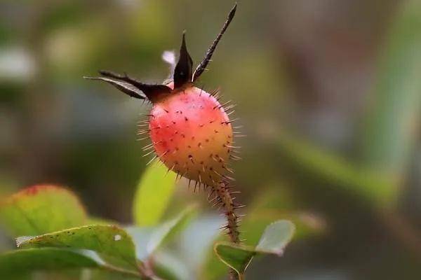 到了深秋十月,金樱子的果实开始转为金黄或红色,果实外表密布硬刺,就像一个微型的糖罐或花瓶,也有人称呼它叫糖罐子。小时候的乐趣就是上山摘金樱子,摘的时候得小心翼翼,生怕被果实上的刺扎到。果实摘下后放在地上捻一捻,磨掉扎手的刺,去掉内里的籽,一口咬下去果肉又甜又涩,对它可是又爱又嫌弃。