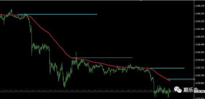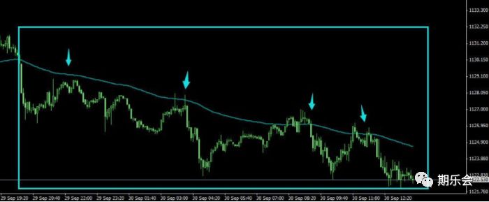 我们再来看一张5分钟图,5分钟均线一直是水平线之下空头走势,这也印证了日线图上的阻力受阻之后,价格下跌走出来的一波小的空头趋势。而且空头趋势一直延续到现在,均线方向都没有改变。