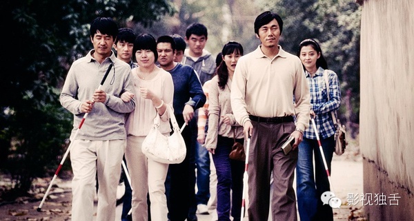 电视剧在盲人的外化体态上下了大功夫。盲人常备笑容,胳膊彼此触碰着前行,敲击脸部来表达爱情,相当轻盈和独到。也在盲人的社会化属性上做足了文章,他们张嘴就试探,扭脸就盘算,做事讲政治,一群人也分左中右。电影没有太多的篇幅来展现盲人感知世界的独特方式,他们做人不那么玲珑圆润,每个人都是一根筋,被爱情所伤的时候多,因爱情喜悦的时候少。