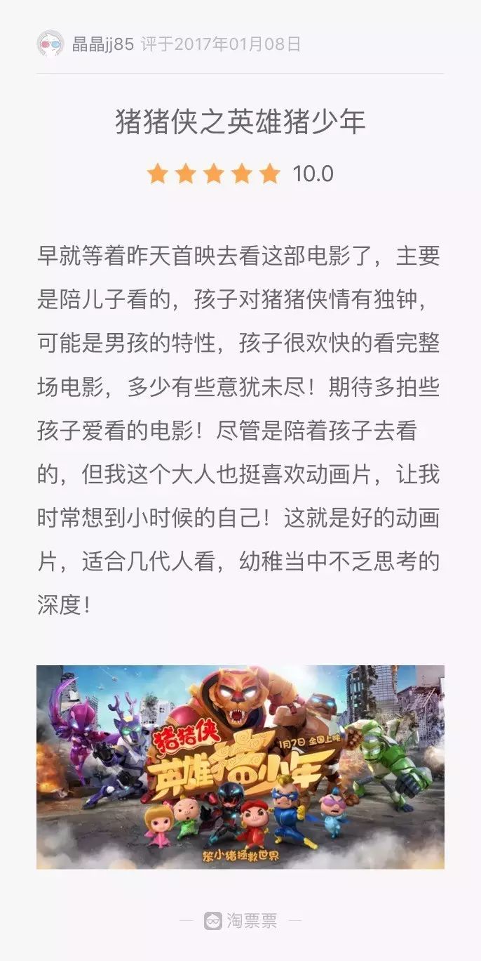 动画电影《猪猪侠之英雄猪少年》在1月7日于全国院线公映,上映一周一直是同类影片上座率冠军,猫眼评分甚至超过好莱坞大片《星球大战外传:侠盗一号》。而无论是元旦点映还是正式公映后,由这只笨小猪牵动的父爱,也引发了很多家长和小朋友的共鸣,同时取得了不错的口碑,大眼萌爸杜江也大呼要带儿子去观影。