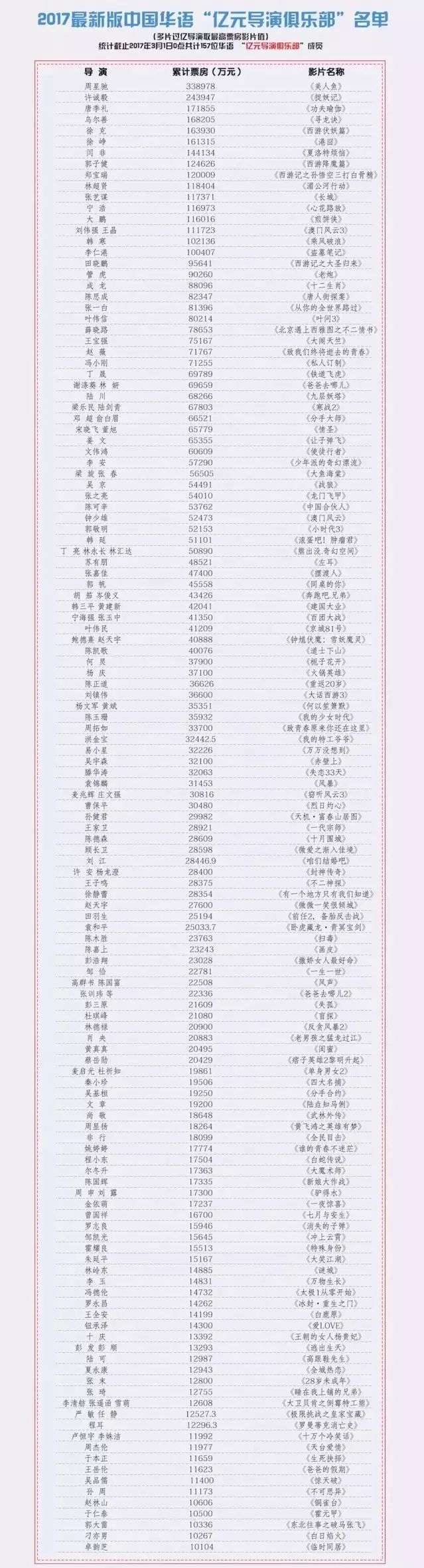 2017开年仅仅两个月,已有11名华语导演突破重围,勇夺国内“亿元导演俱乐部”11张入场券。统计截止到2017年3月1日0点正,中国华语电影“亿元导演俱乐部”成员已经达到了157人。