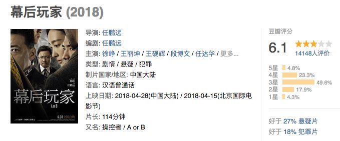 同时,《幕后玩家》的豆瓣评分一直下降,早上还是7.0,到了晚上已经降到了6.3,截至发稿,已降到了6.1。如果口碑持续下滑,恐怕难以达到猫眼的预测票房。