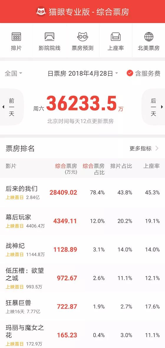 猫眼专业版显示,《幕后玩家》首映日的票房累积4349万,排名第二。而跟它同一天上映的《后来的我们》,其票房达到2.8亿,遥遥领先地登上了票房榜冠军,且形成了票房冠军和亚军之间的巨大差距。