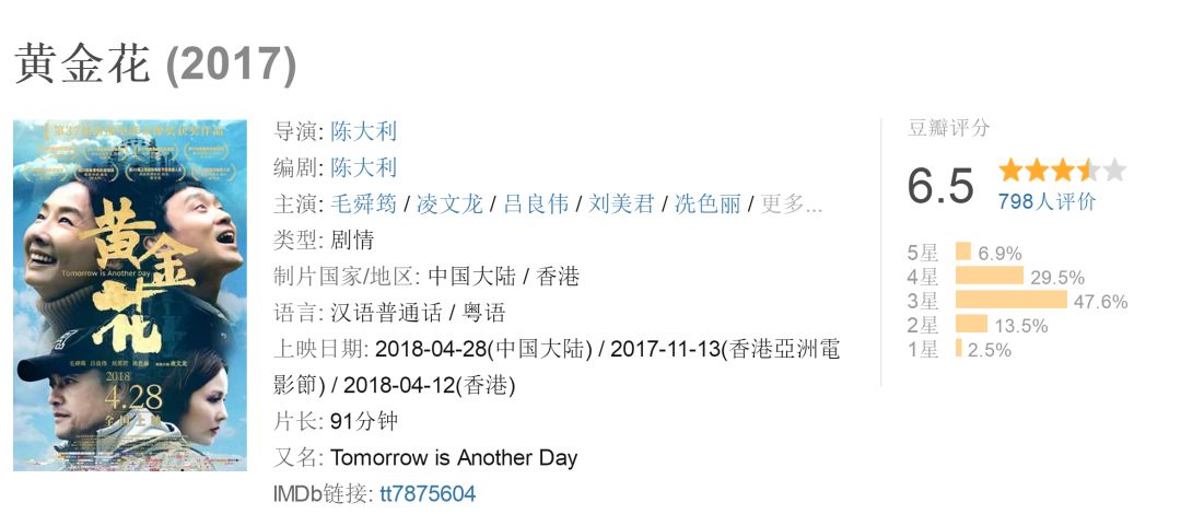 去年的五一档,包括《拆弹专家》、《记忆大师》、《喜欢·你》、《春娇救志明》,都是质量过硬的口碑之作,《拆弹专家》当时评分最低,可也有6.9的评分,其余均是7分以上。反观今年的五一档,评分最高的是《黄金花》,仅为6.5。
