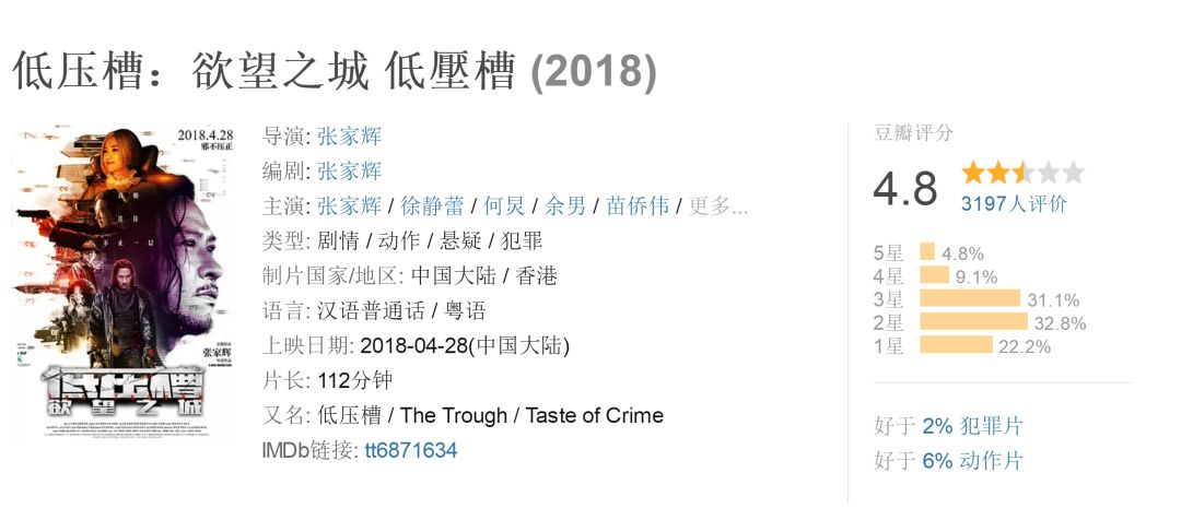 而作为张家辉导演的大陆首秀,《低压槽:欲望之城》同样也被很多人期待,可现实却是豆瓣评分4.8,五一期间票房不足3000万。虽然之前他已经拍了两部电影,但从这些影片最后的表现来看,“演员”身份显然更适合张家辉。http://si1.go2yd.com/get-image/0MoqC9N2U08