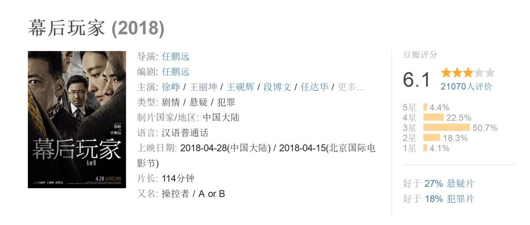 其他电影就没有这么好命了。徐峥主演并监制的《幕后玩家》,在北京国际电影节期间,曾作为开幕影片亮相,作为少见的涉及金融犯罪的国产影片,它被很多人寄予厚望。但是,开画之后口碑显然没有达到预期,目前豆瓣评分为6.1,四天票房不足2亿。不过,值得一提的是,在排片量减少的情况下,其单日票房有小幅度增长,即所谓“逆跌”。http://si1.go2yd.com/get-image/0MoqCAo9Oro
