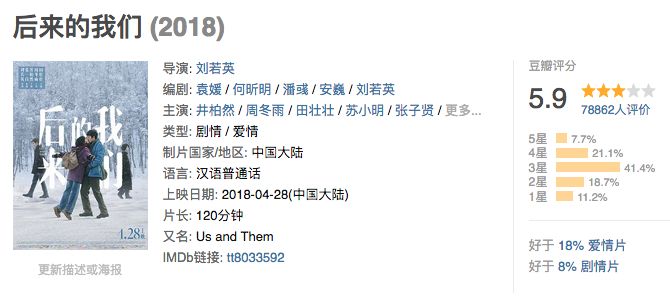 这样算下来,一部《后来的我们》在票房上比其他同档期上映的新电影加起来还要多,可谓“一超多弱”,但无论“一超”还是“多弱”,口碑几乎都是不及格状态。