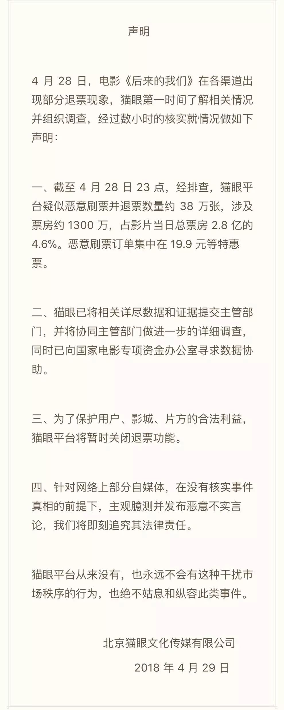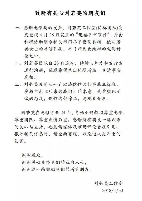 作为刘若英转型导演的处女作,《后来的我们》被寄予厚望。可谁料,就在上映首日当晚,全国近4000家影城均不同程度出现了《后来的我们》退票事件。一时间众说纷纭,随后涉及到的主要平台猫眼以及刘若英工作室都发布了声明,各方都表示自己和刷票事件无关。