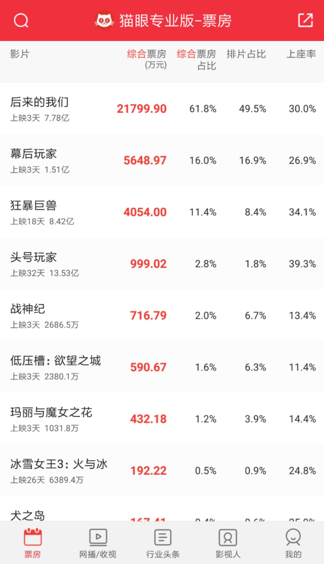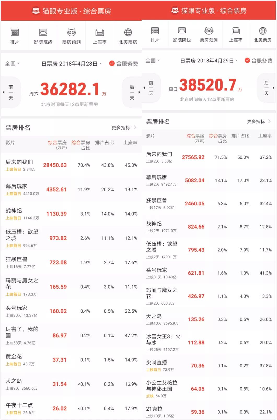 更有意思的是,到了4月30日,已经上映一个月的《头号玩家》占据了当日票房榜的第四名,挤掉了新片《战神纪》。而且从当天数据来看,《狂暴巨兽》和《头号玩家》的上座率比新片都高。