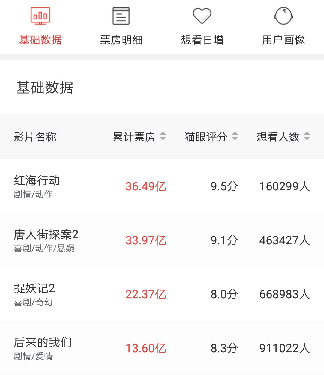 2018年上半年,有4部国产电影票房超过10亿,其中3部来自春节档:以36.5亿的成绩暂居2018年国产片票房冠军的《红海行动》、近34亿的《唐人街探案2》、22.37亿的《捉妖记2》、13.6亿的《后来的我们》。