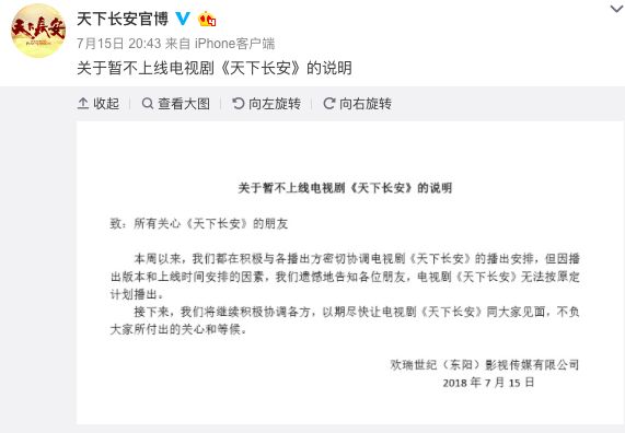 就在《天下长安》即将开播前一天,该剧官博贴出“关于暂不上线电视剧《天下长安》的说明”。官方宣布的临时撤档原因是,“因播出版本和上线时间安排的因素,电视剧《天下长安》无法按原定计划播出。”从4月开发布会以来,《天下长安》经历了整整3个月依然还没播出。