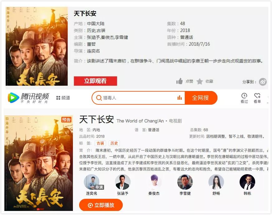 央八虽然撤了《天下长安》的播出时间表,但在央视官网上依然保留了该剧的信息介绍,其中《天下长安》的集数为48集。而在腾讯视频上,《天下长安》的集数显示为68集,两个版本相差20集。