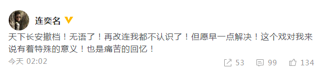 该剧导演连奕名随后发了一条微博,情绪略显激动,连用了6个感叹号:“《天下长安》撤档!无语了!再改连我都不认识了!但愿早一点解决!这个戏对我来说有着特殊的意义!也是痛苦的回忆!”