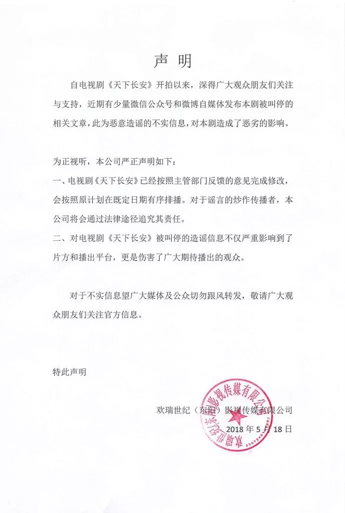 5月18日,该剧官博发布声明:电视剧《天下长安》已经按照主管部门反馈完成修改,会按原计划在既定日期有序播出。尽管这则声明提到了“谣言严重影响了片方和播出平台”,但播出平台依旧是个谜。