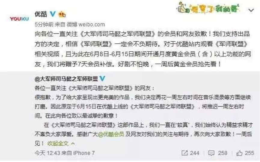 《军师联盟》的例子和《天下长安》更加类似。《军师联盟》原定于在2017年6月15日优酷上线,以会员领先十集的方式开启“先网后台”的新时代。由于开播前卫视的反弹,《军师联盟》把网台“窗口期”从一周缩短为19.5小时。不管是“五十步”还是“一百步”,优酷想在电视台最优剧目下夺食的激进战略都打了折扣。
