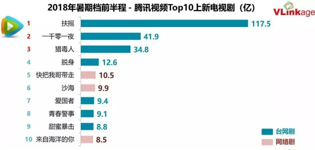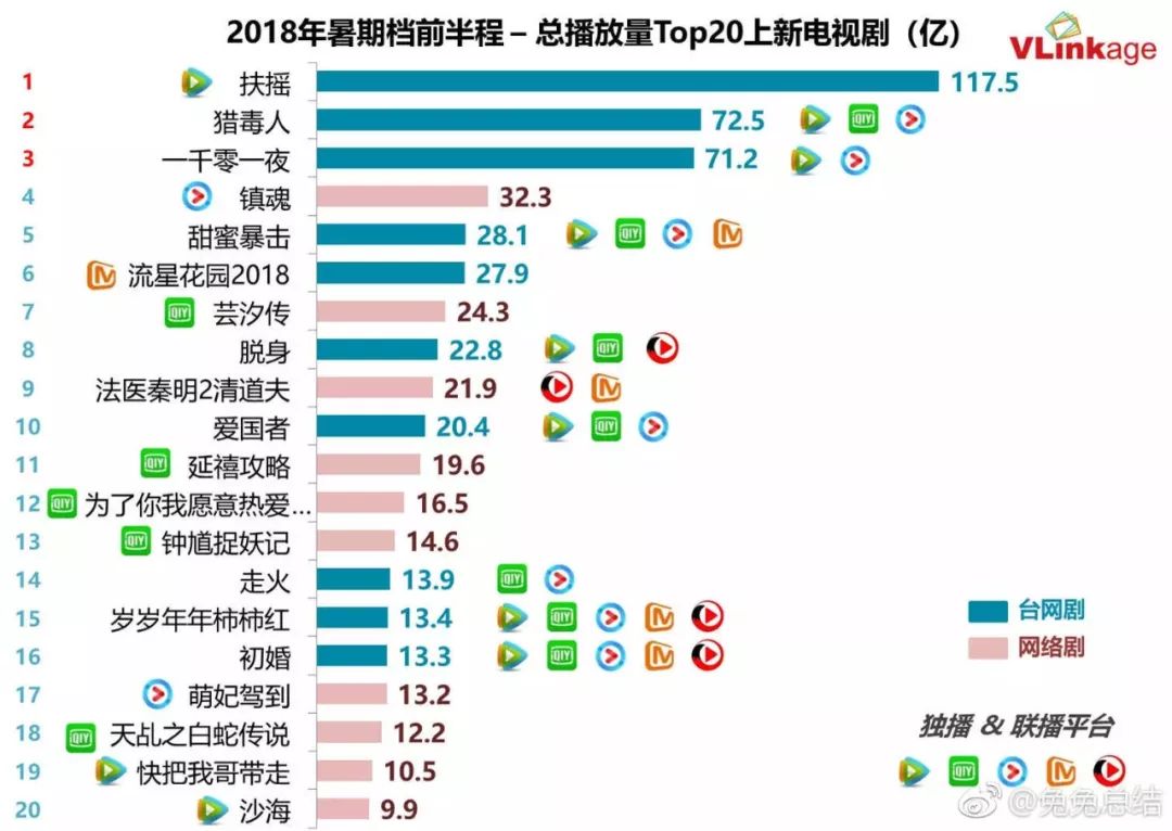 昨晚,《扶摇》正式在腾讯视频收官,腾讯视频单平台播放量超130亿。而根据VLinkage于8月5日公布的“2018暑期档前半程——总播放量TOP20上新电视剧”榜单,位列第一名的《扶摇》,播放量是第二名的1.6倍余,且第二名为腾讯视频、爱奇艺、优酷视频三大平台联播剧。