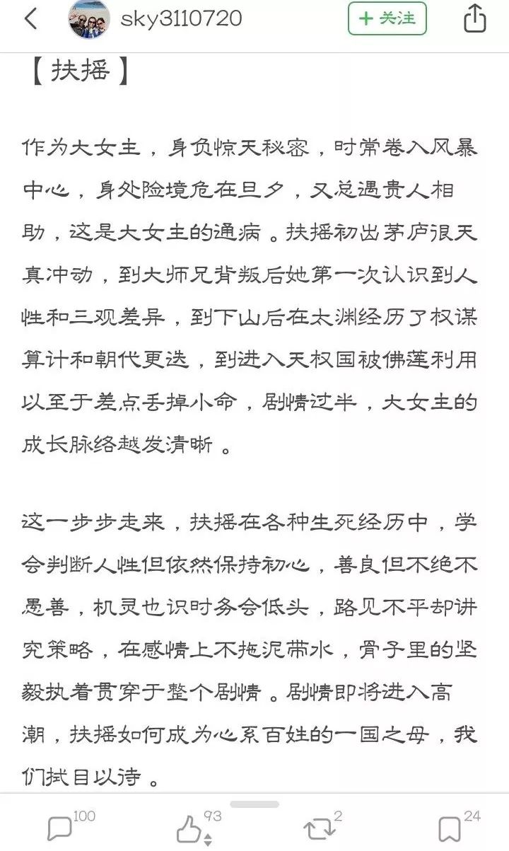 自6月18日登陆浙江卫视中国蓝周播剧场和腾讯视频以来,《扶摇》播出的时间跨度为50余天,不断创下浙江卫视中国蓝周播剧场收视新高,#电视剧扶摇#微博话题,登微博电视剧一周报告全站短视频博文量冠军,并屡次登上微博移动端发现页话题推荐位。在同档期不停有新剧上线的情况下,《扶摇》能从竞争激烈的暑期档脱颖而出,不外乎如下几个原因。