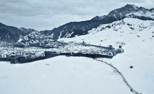 雪地里,人骑着马奔向远方的一座城,是剧组在新疆的荒地上搭建的北都城。