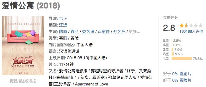 在票房集体跳水的背后,是豆瓣的超低评分:《爱情公寓》2.8、《新乌龙院之笑闹江湖》3.6、《欧洲攻略》3.7、《阿修罗》3.1……