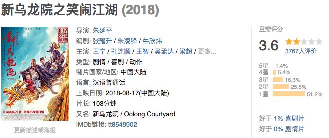 《新乌龙院之笑闹江湖》的豆瓣评分为3.6,作为“乌龙院”系列IP为主要宣发点的电影,也算是一代人的青春记忆。