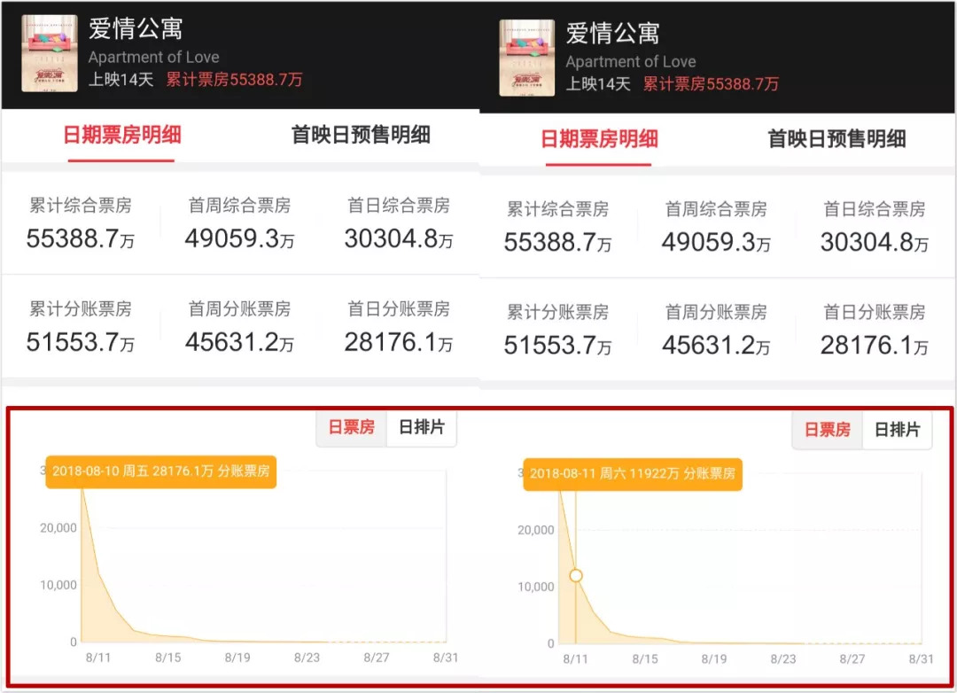 卖情怀一直是电影宣传的重要手段,要么是原班人马N年重聚的噱头,要么是“欠某某一张电影票”的腔调。《爱情公寓》或许会成为中国电影营销史上的一个转折点。开画当天拿下3亿票房,第二天就是超过50%的大跳水。