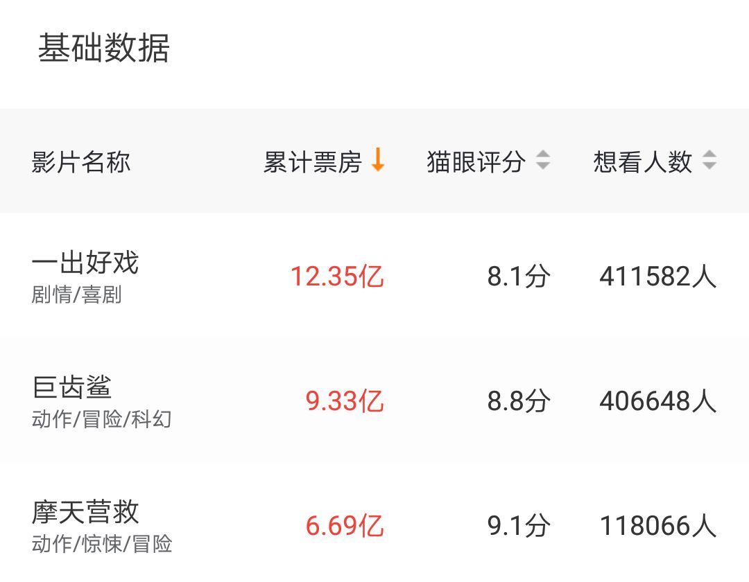 暑期档票房前五的后三位分别是目前12亿多的《一出好戏》、9.33亿《巨齿鲨》和6.69亿的《摩天营救》。相比于去年一部《战狼2》,其票房等于暑期档第二到第九名之和的畸形状态,今年暑期档的市场就要好很多,毕竟一个成熟的电影市场,不能仅仅依靠几部高票房的影片。缺乏足够数量的中等体量影片支撑,很难有良性发展。