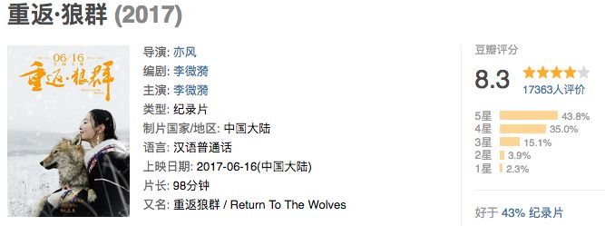 值得一提的是,去年还有一部成绩抢眼的纪录片《重返狼群》,讲述一名女画家在草原采风中发现一只被遗落的幼年小狼,她带小狼回家,喂养小狼长大,最后把小狼放归大自然的故事。