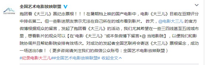 在全国艺联的微博上,全是《大三儿》的宣传微博,可以说《大三儿》是全国艺联近段时间的“种子选手”,但是,仍旧有加盟影院“堂而皇之”不给排片,那是相当“有勇气”了。说到头,还是影视行业的老话题:资本逐利不多说,契约精神是神马。