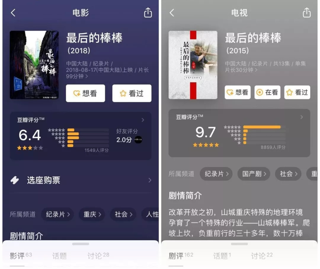 这大概就是,近些年涌现的电视版纪录片剪辑而成的电影,如《最后的棒棒》、《舌尖上的中国》、《我在故宫修文物》,虽然电视版有口皆碑,声望很高,但是一进院线,就遭遇口碑和票房的“门不当户不对”。