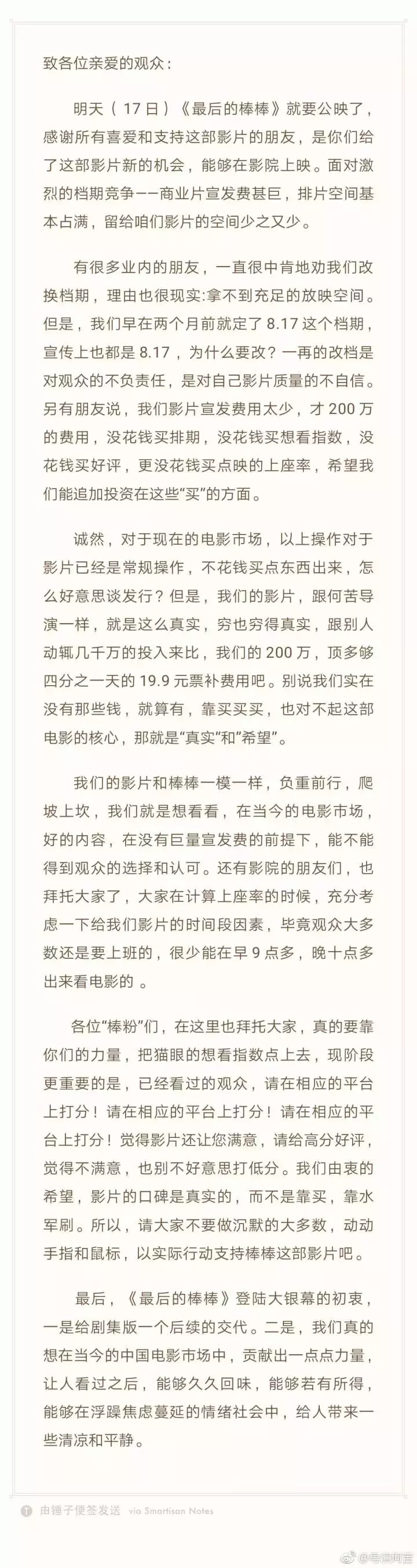 在《最后的棒棒》上映前,不少影视媒体都对这部超高分佳作表示期待,一时可谓“千呼万唤”。