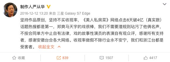 这次新闻发布会后不久,《美人私房菜》制作人严从华发微博正面回应,该剧收视率低是“因为没有在收视率上作假”。尽管浙江卫视将《美人私房菜》调到午夜档,安徽卫视依然坚持在黄金档播完。严从华表示感谢安徽台和各大网络,“我们和浙江台都是受害者”。