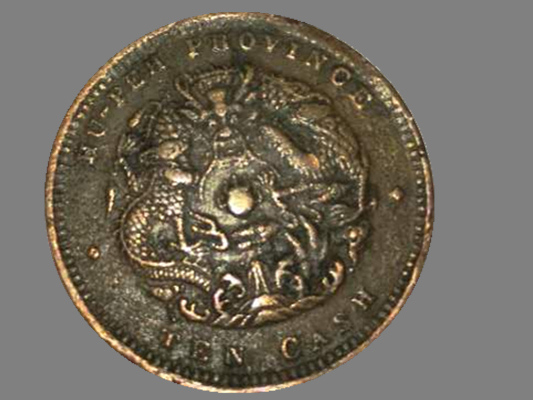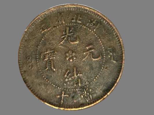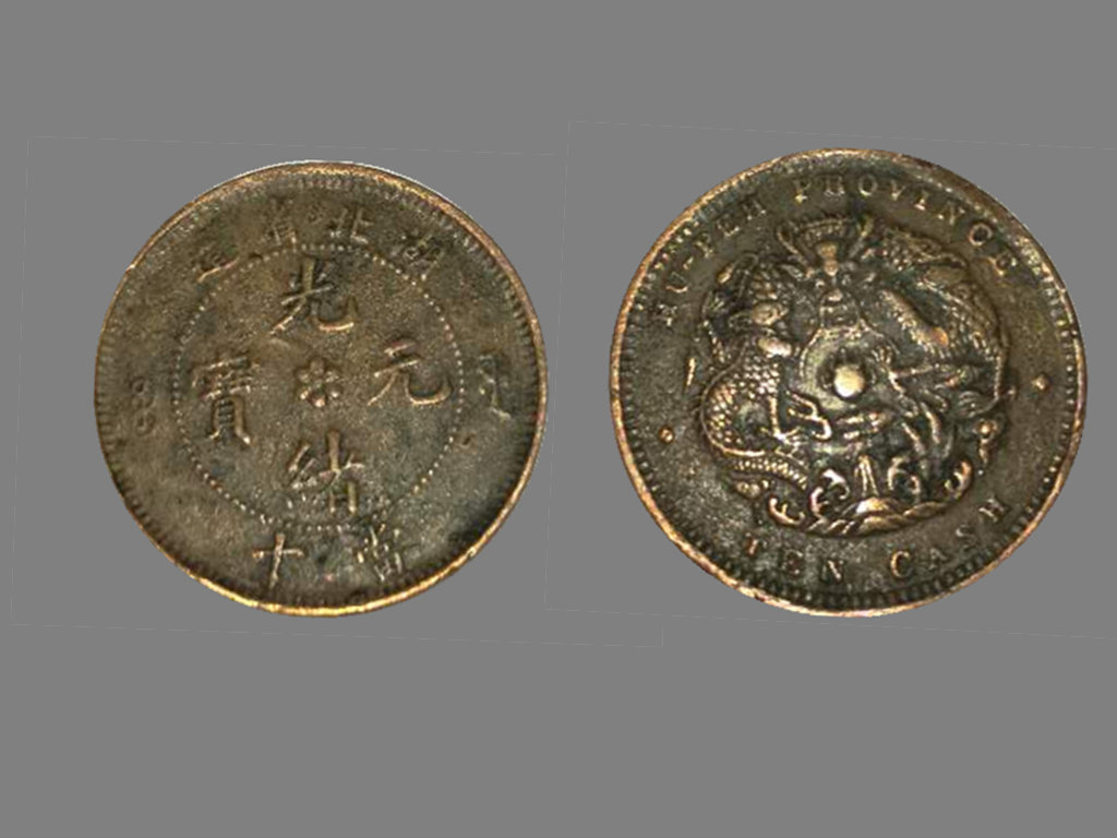 此湖北省造光绪元宝当十铜币,直径约:2.8cm,重约7.5g。该铜币正面珠圈内铸汉书“光绪元宝”字样,中央六瓣梅花纹饰,圈外上环书“湖北省造”,下环书“當十”,左右各书有满文钱局名。