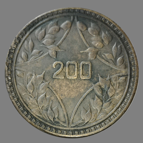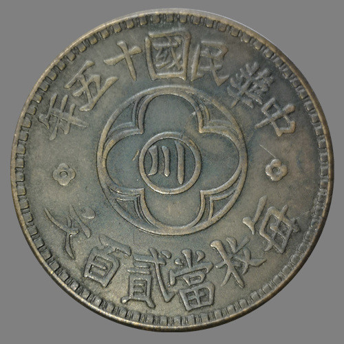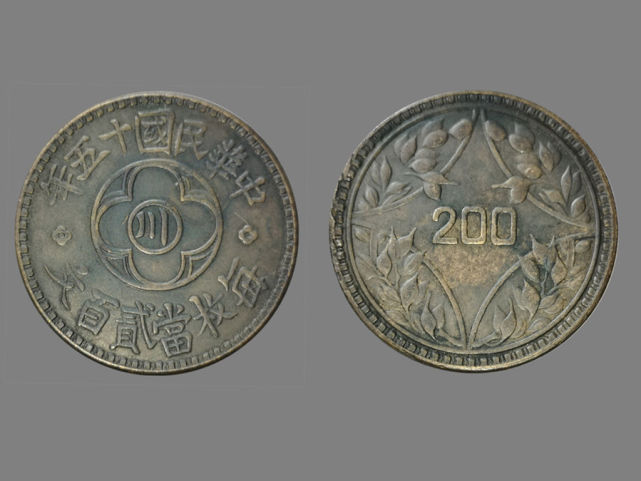 民国十五年四川贰百文铜元是军阀统治时期四川成都造币厂出品,由于极为稀少,拍卖场已经多年未见其好品相的踪影,该钱币确实为民间留存下来的历史真币。正面币中心突起,上面以阳文铸省(局)简称川,左右有十字空心花,边缘内上镌中文书“中华民国十五年”七字、边缘下携中文书“每枚当贰百文”背面中央为数字200,四面为半圆形图案,图中有花叶。
